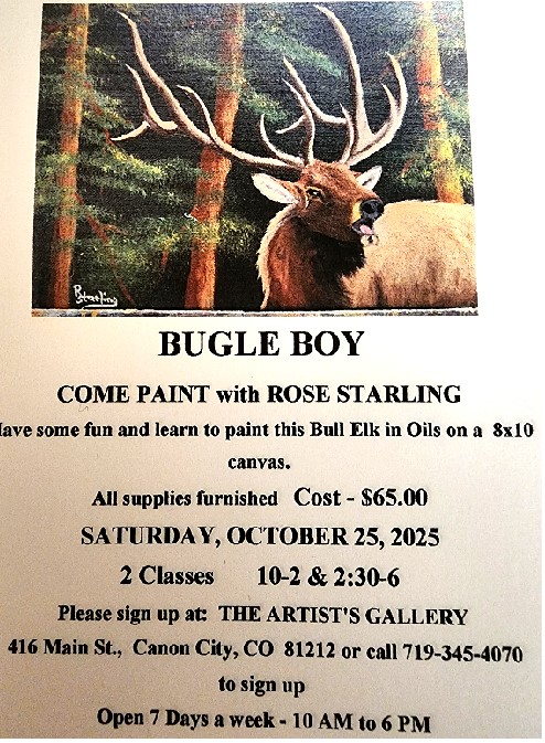 20256 week class at the Pueblo Art Guild at Mineral Palace Park starting October 6 at 1:30 to 3:30. Cost will be $75.00. If you want me to furnish the paint and brushes, that will be an additional $20. When you sign up, I can give you a complete supply list. The painting will be done on a 12x24 canvas. Ill have them for sale for $20.00. Call, text or email me if you are interested in signing up for the class.